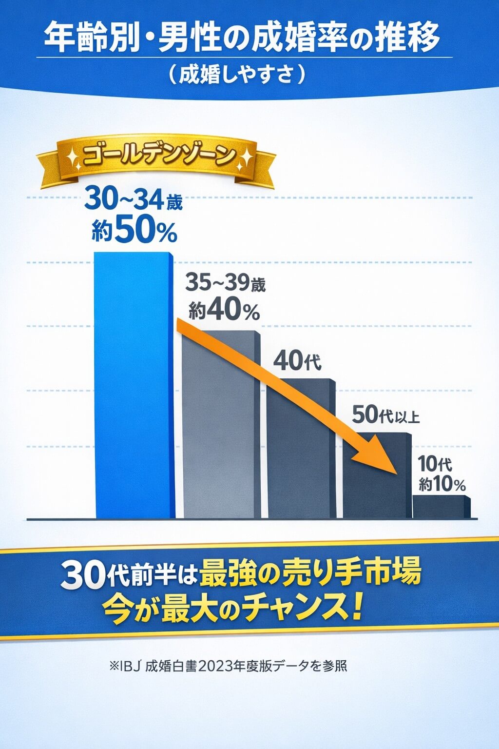 「IBJ成婚白書」のデータが示す通り、30代男性は結婚市場において圧倒的な需要があります。