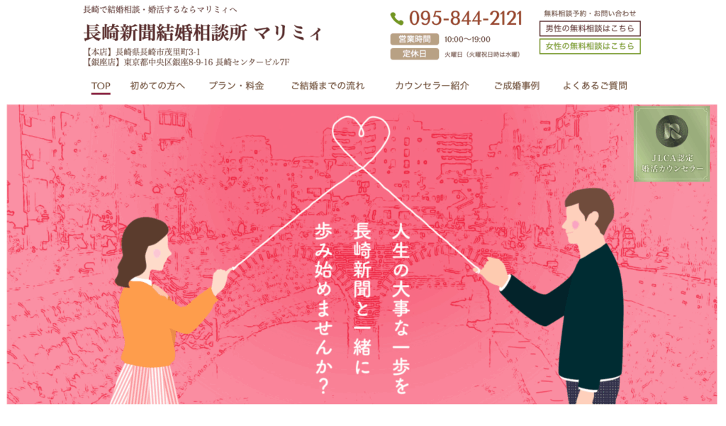 特徴 | 長崎県長崎市で17年。会員は地元愛が強く、年収も高め。 | 複数オフィスを抱える結婚相談所。お見合いの申請可能数が多いのが特徴。 | 長崎新聞が運営。新聞会社の情報網を活かした結婚相談所。 | 長崎県が運営。地元の人同士の婚活に向いている。 | オシャレな雰囲気の結婚相談所。大手にはないプラン内容が魅力。 |