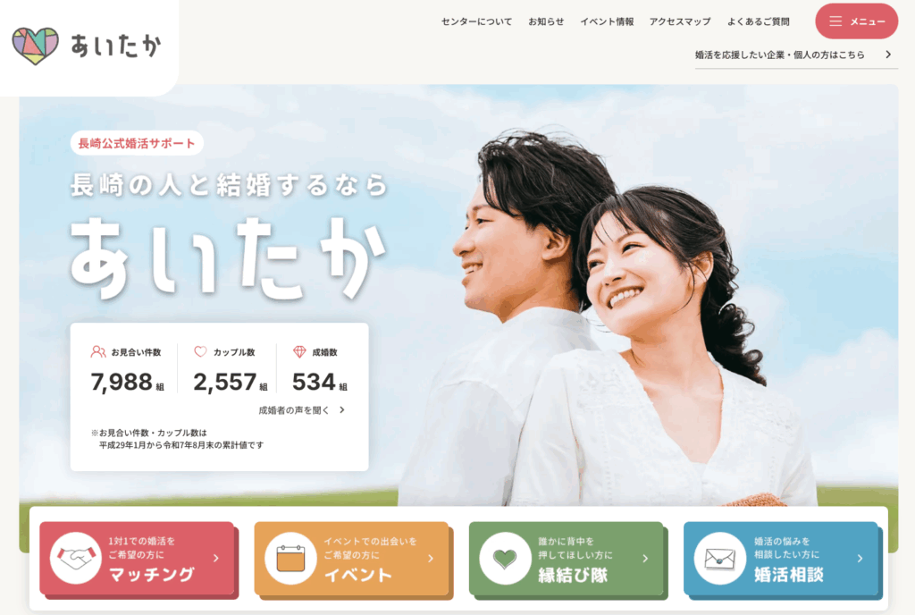 長崎県が運営している婚活サポートセンターです。企業間交流事業もあり、より安心して婚活を楽しめます。婚活をサポートする方が150名と多いです。