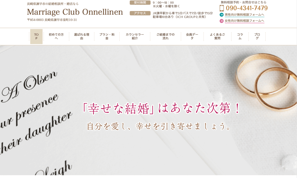 長崎だけでなく、福岡、大阪、千葉にもオフィスを構える結婚相談所です。成婚率81.1%。(2019/8~2023/5の成婚退会者43名/退会者53名から割り出したもの)国内大手IBJ・BIU・TMSの3社に加盟しています。